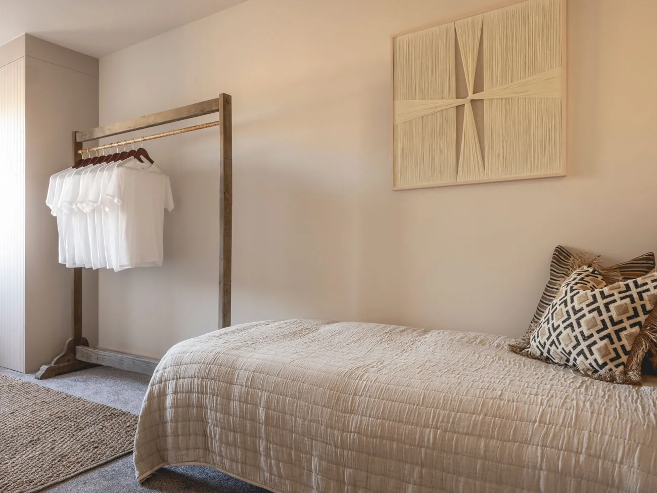 Our larger home comes with four comfortable bedrooms, each featuring a double bed with underbed storage and a full size wardrobe. Two of the bedrooms have en-suite bathrooms. Your generous living space includes two bathrooms, an open plan living and dining area, a fully-equipped modern kitchen with Bosch appliances, oven, 4-ring hob and washer-dryer and a private garden.